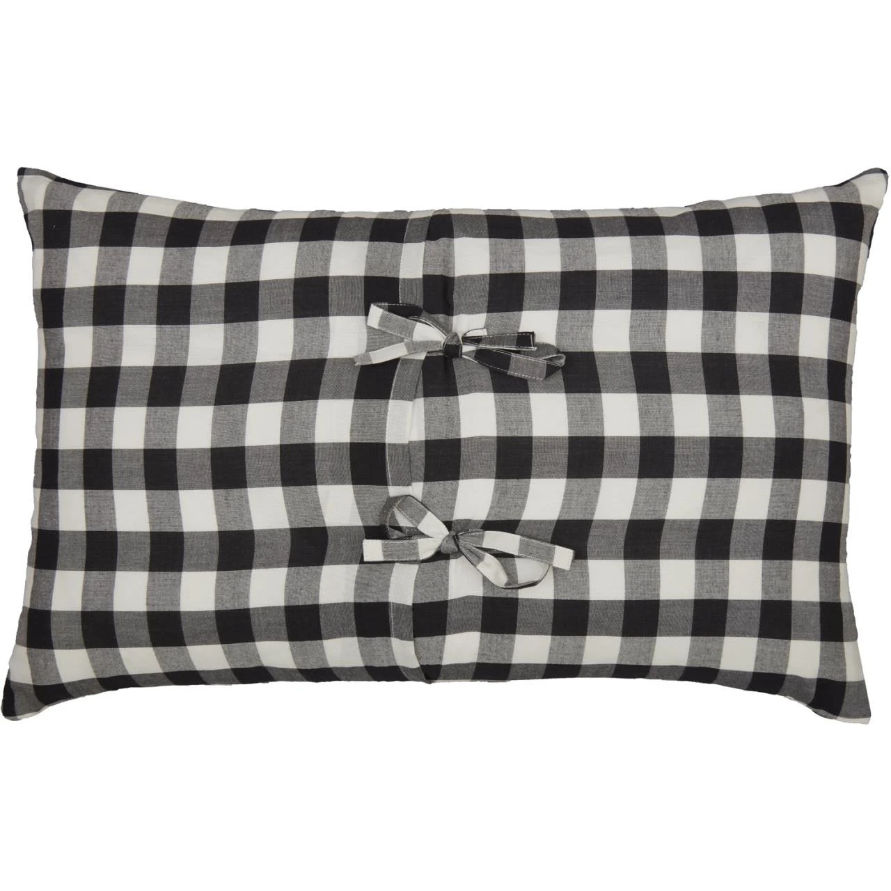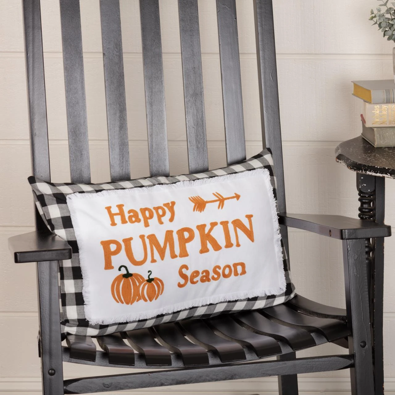 Celebrate your love for autumn with this Annie Buffalo Check Black Happy Pumpkin Pillow by VHC! The front is outlined in black and white buffalo check and reverses to a plain check with tie closures on the back. Such a beautiful season!