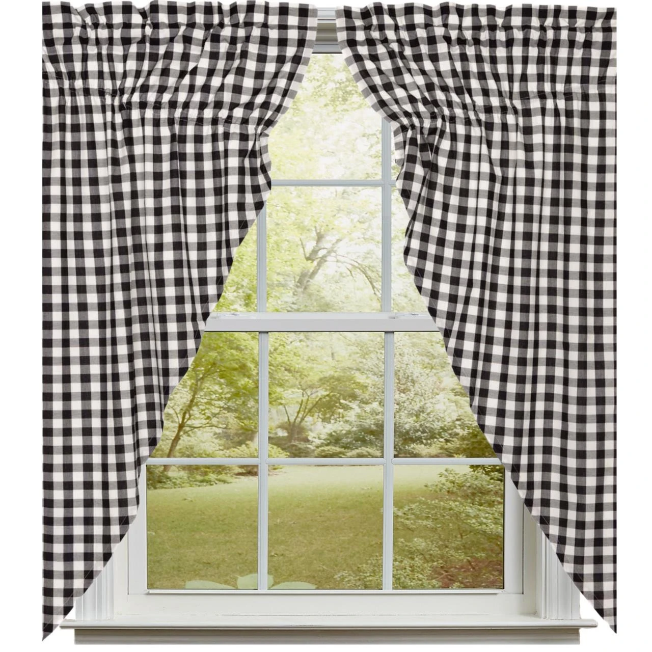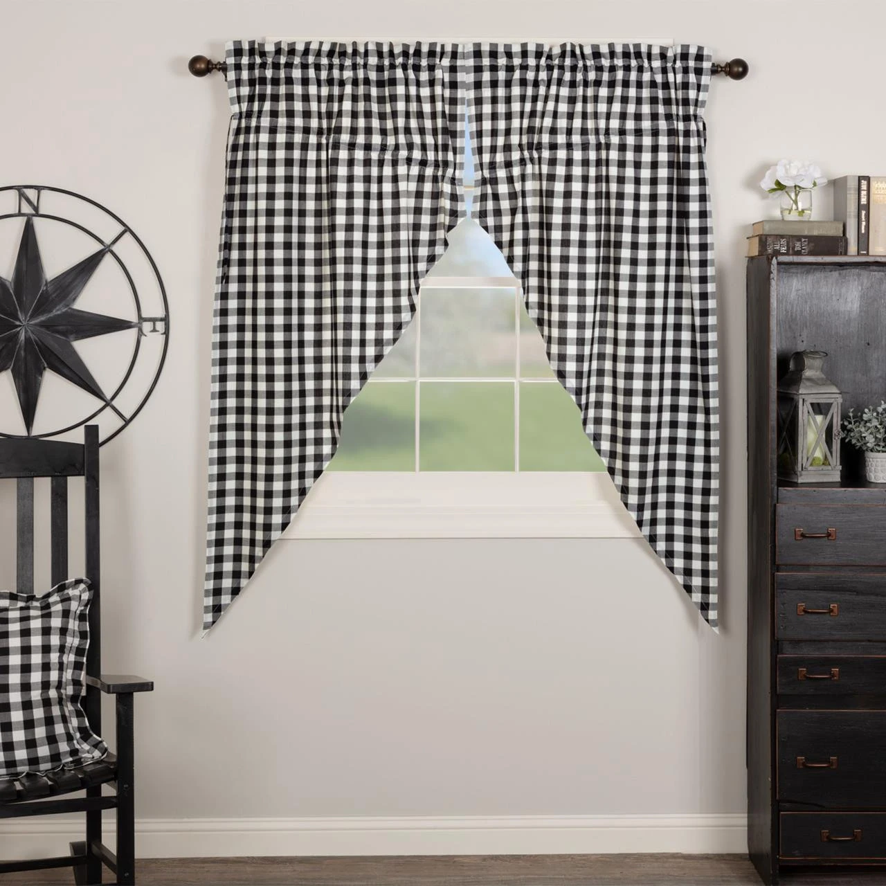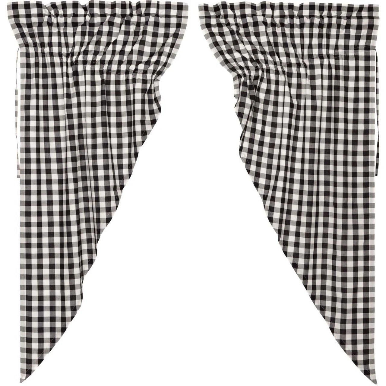 The Annie Buffalo Check Lined Prairie Gathered Curtain Set keeps your window decor lighthearted with a crisp and modern black and white large check while staying true to classic country styling.