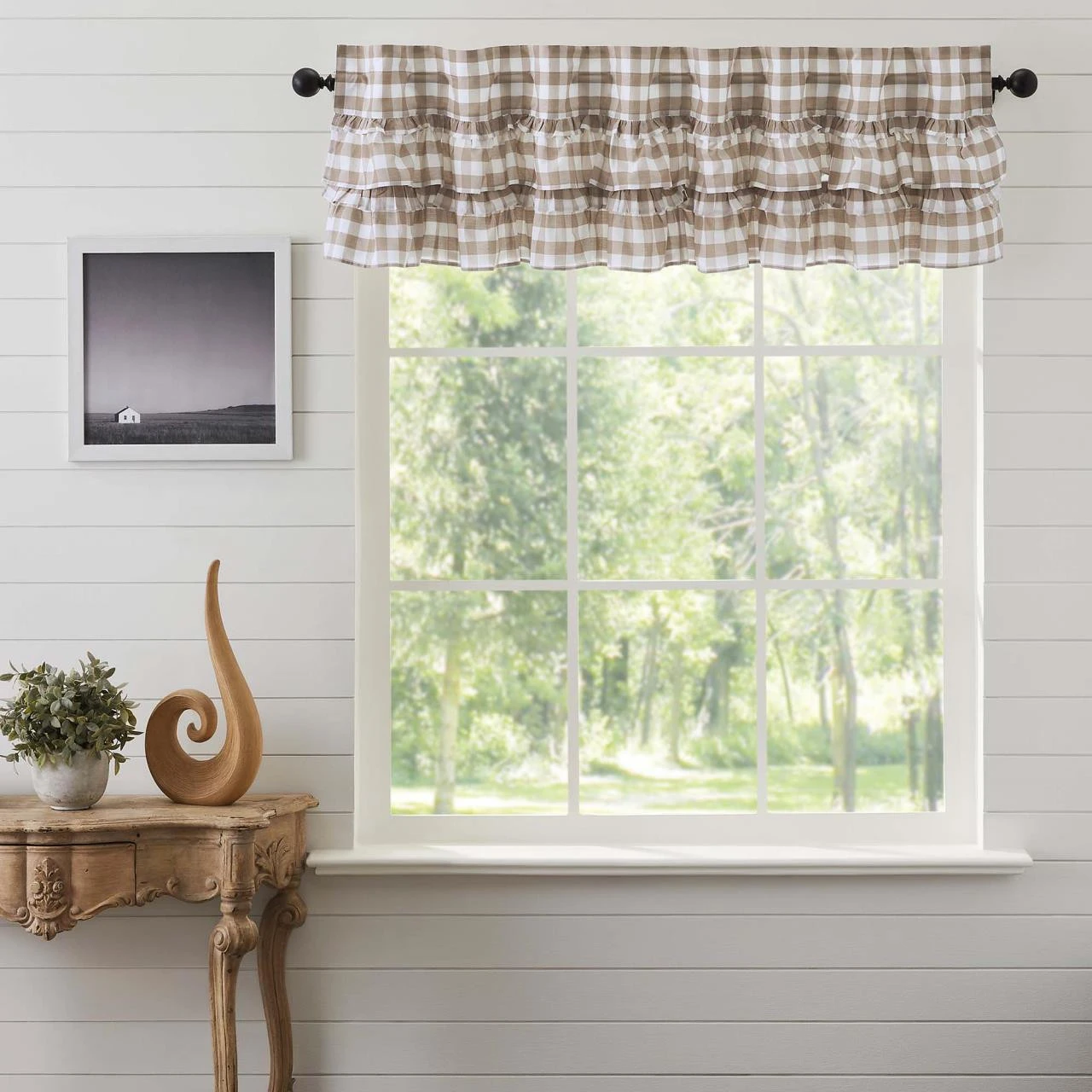 Spruce up your window with the Annie Buffalo Portabella Check Ruffled Valance by VHC! The charming buffalo check pattern features soft portabella brown and white! The perfect addition to any country decor! The trim of ruffles is the perfect finishing touch!