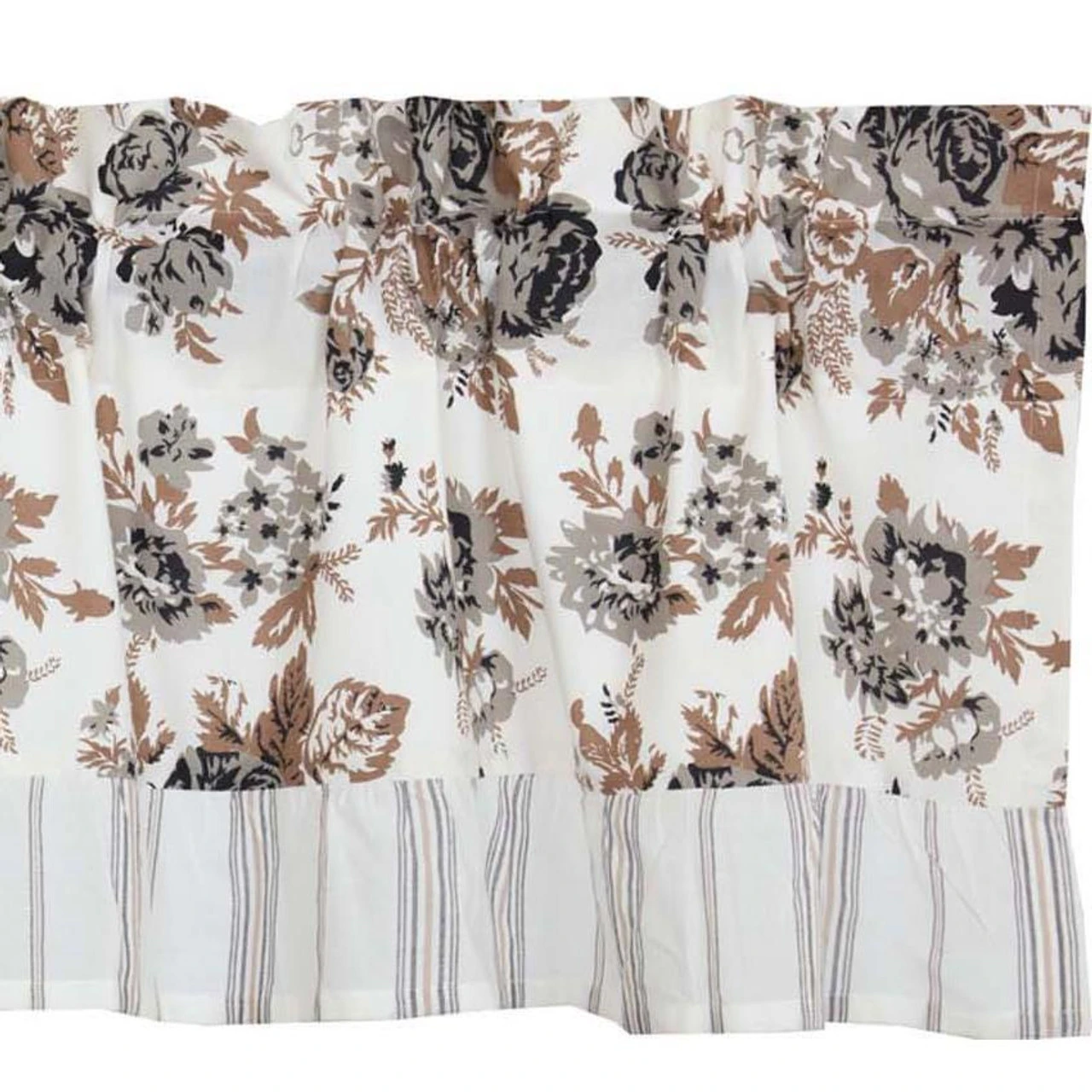 Brighten up your windows with the Annie Portabella Floral Ruffled Valance by VHC! The valance features a floral print in the beautiful colors of brownstone, candlelight white, and warm grays, with a white cotton lining. The striped ruffle is the perfect finishing touch!