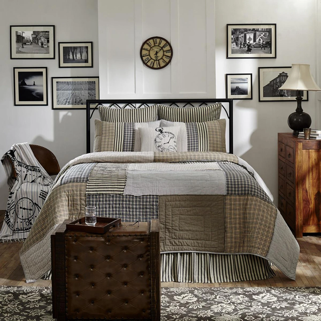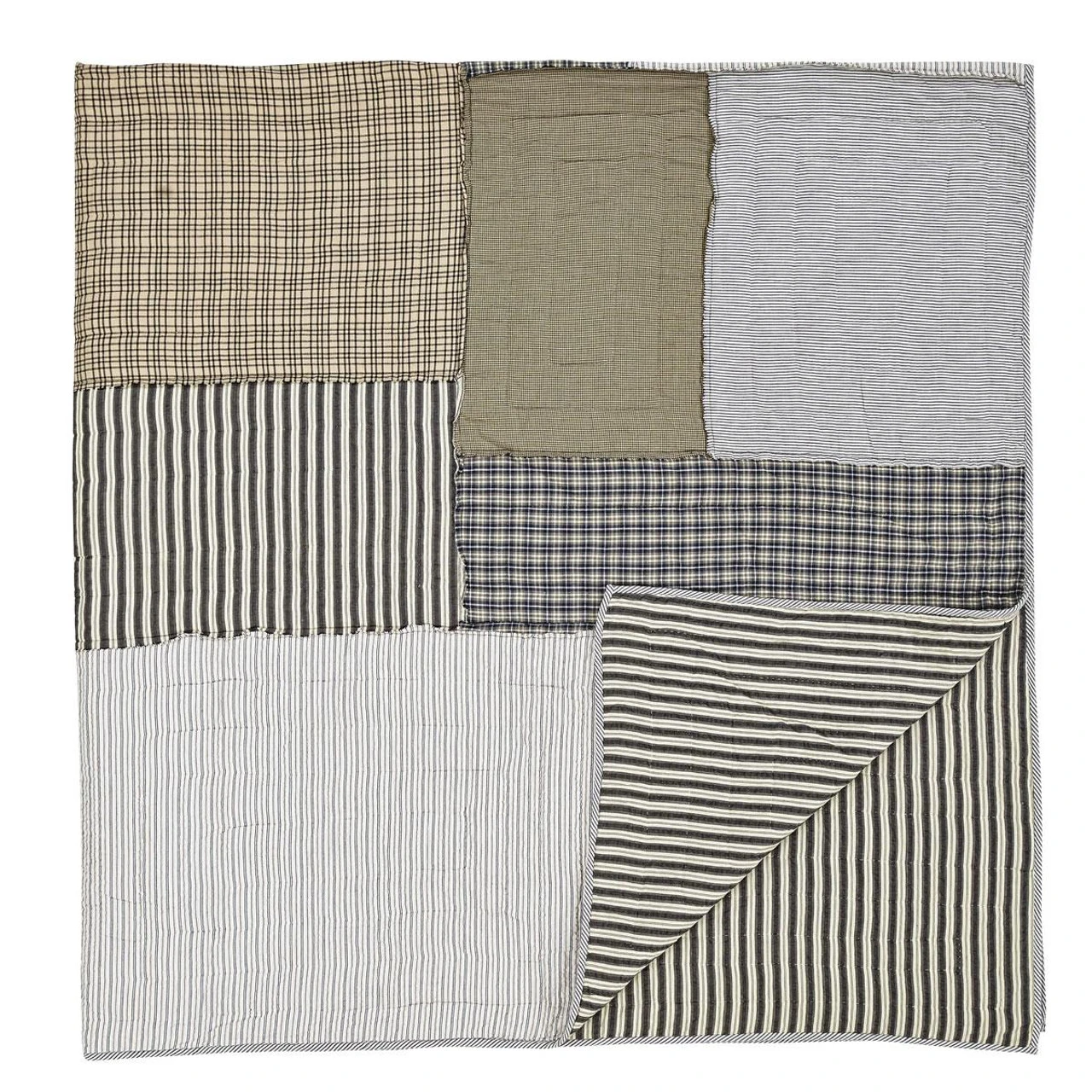 Relax in the classic country blend of stripes, plaids & solids that encompass this charming quilt! Featuring a random block pattern & heritage ticking stripes in the comfy country colors of cream, khaki, taupe & black, this collection oozes peace, serenity & country charm.