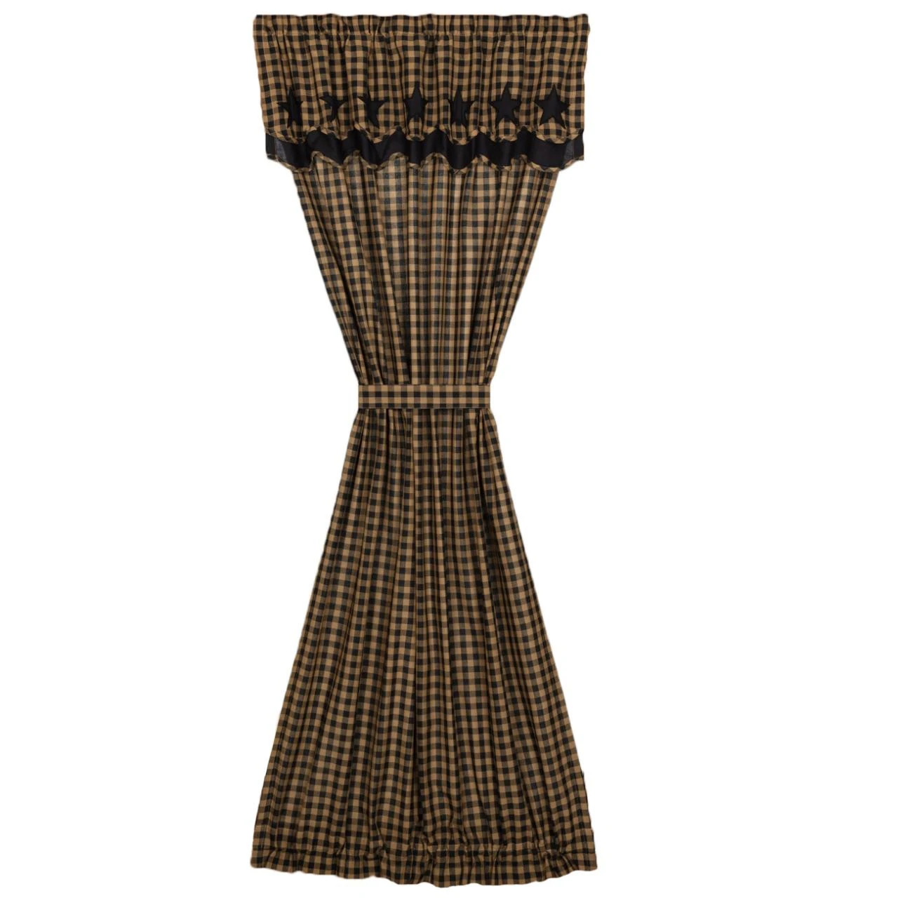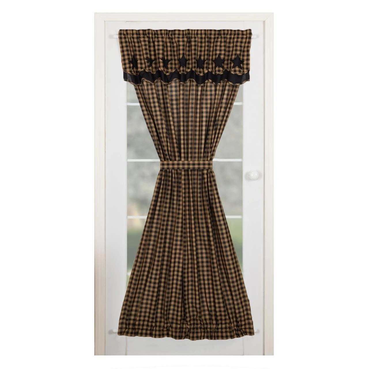 Dress your door with modern farmhouse charm and style with the Black Star Door Panel With Valance by Victorian Heart! The panel features a check pattern in black and tan, with 5-point stars appliqued in solid black fabric on the valance. So country charming!