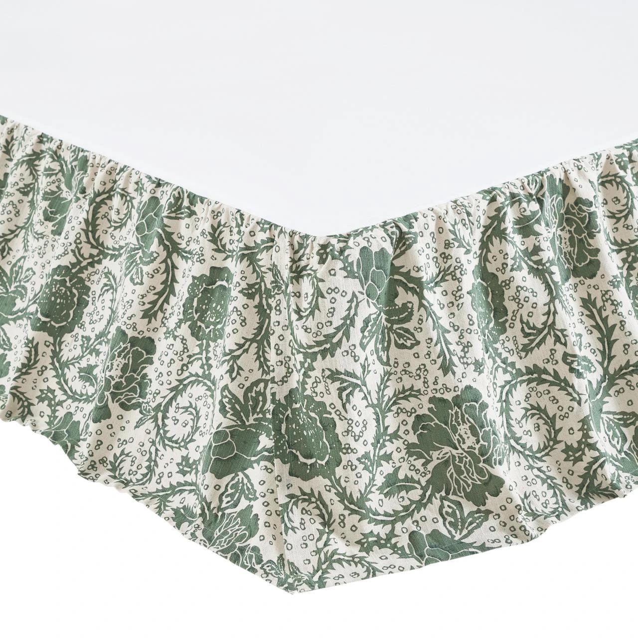 Dress your bed with the Dorset Green Floral Bed Skirt by VHC! The pattern features a floral print in the beautiful colors of quaker green and candlelight white. Available in three different sizes (each sold separately).