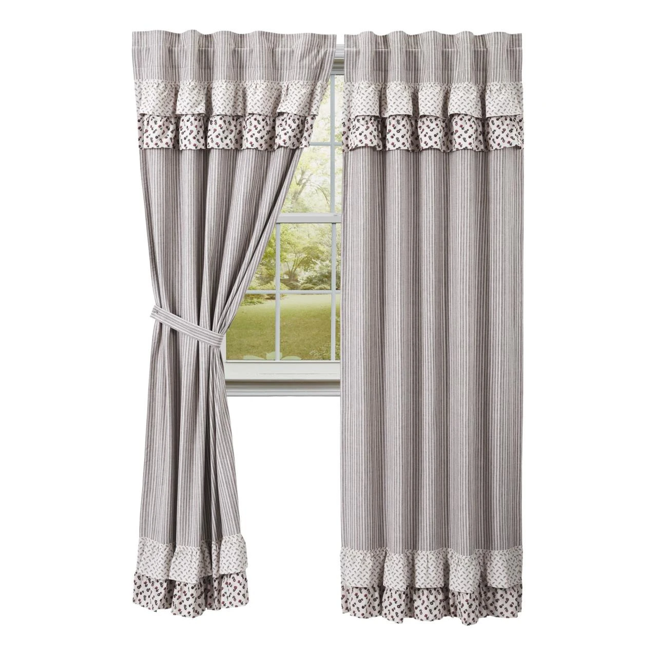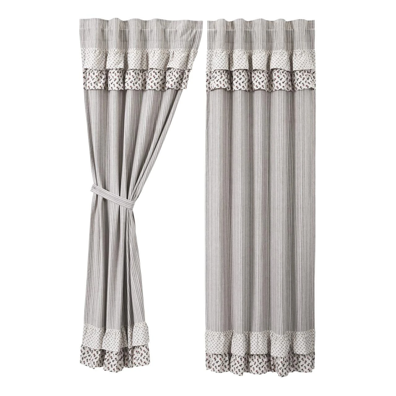 A unique look and the perfect complement to the Florette bedding items. The Florette Ruffled Panels by VHC take the fabrics from the quilt to create the ruffled valance, adds in the ruffle accent on the bottom of the panels, and finishes with the walnut and candlelight white striped base of the panels. Super charming!