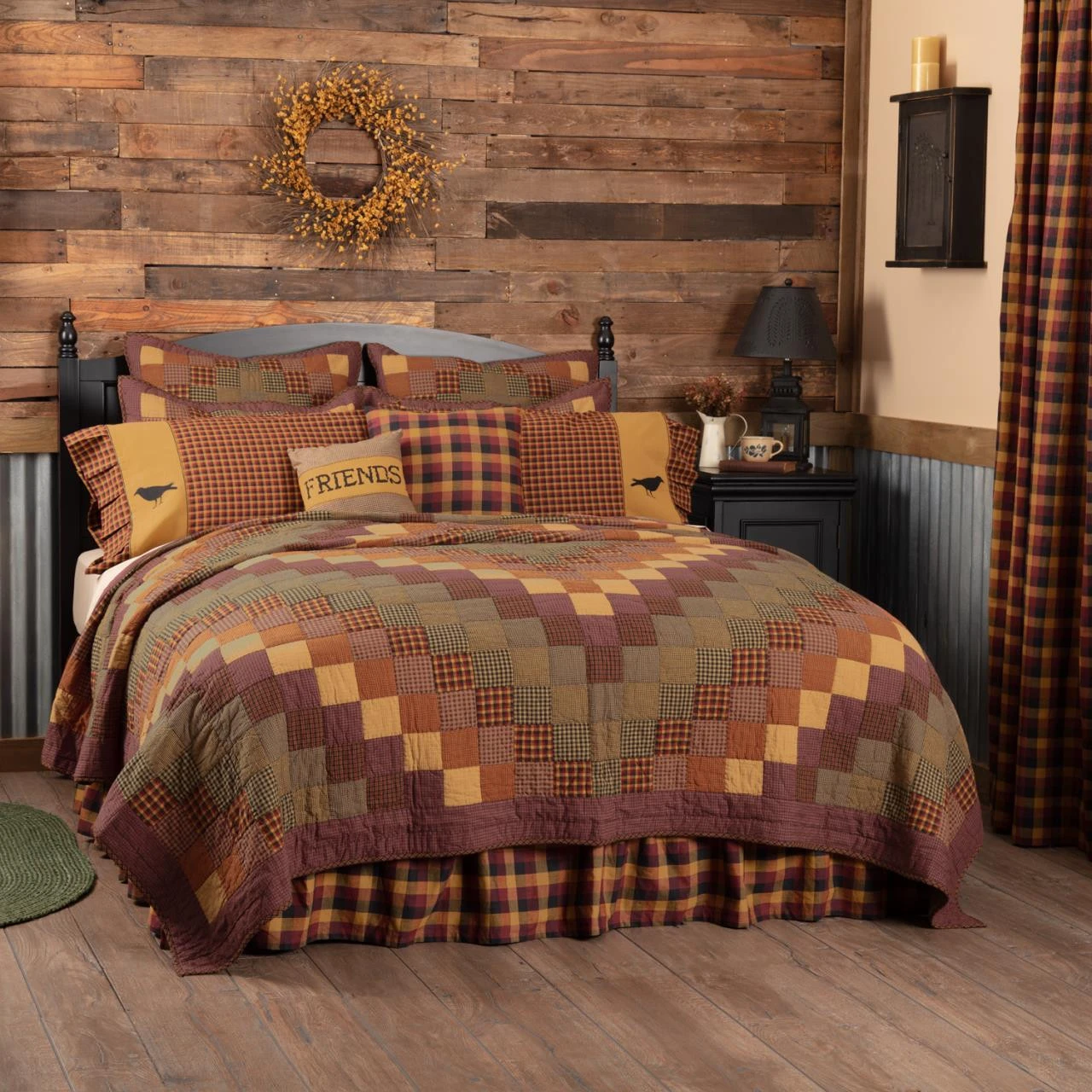 Dress up your bed with the gorgeous Heritage Farms Quilt by VHC! Featuring warm tones of chamomile, patriotic red, black, butter yellow, forest green, and wine in a charming patchwork pattern, this quilt is sure to be the perfect addition to your country bedroom decor!