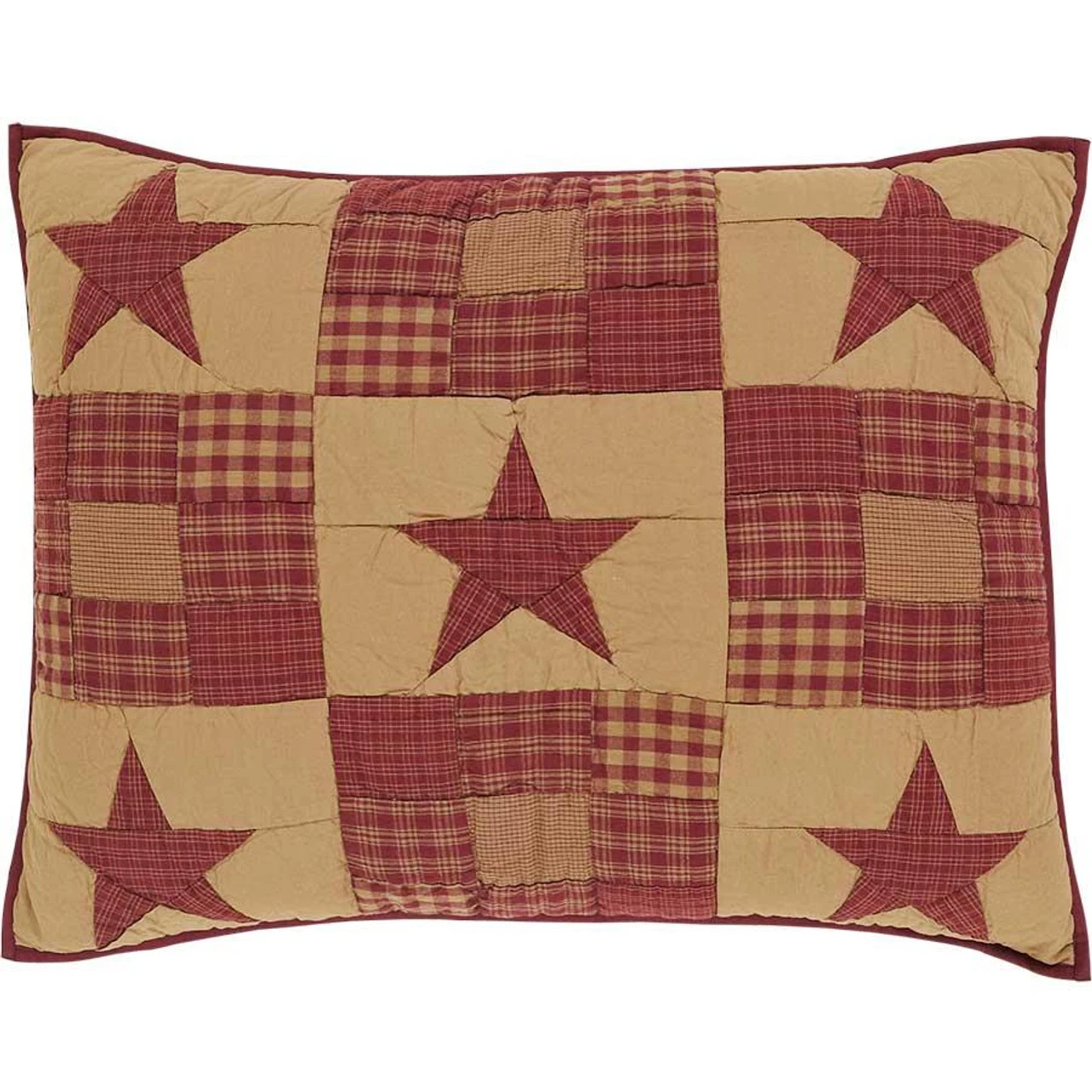 Coordinate your bedding beautifully with this Ninepatch Star Standard Sham! Featuring a traditional country patchwork block pattern with appliqued 5-point stars in garnet & sand, the mini checks & plaids add to its charming appeal! A stunning piece that will be the “star” of your home decor!