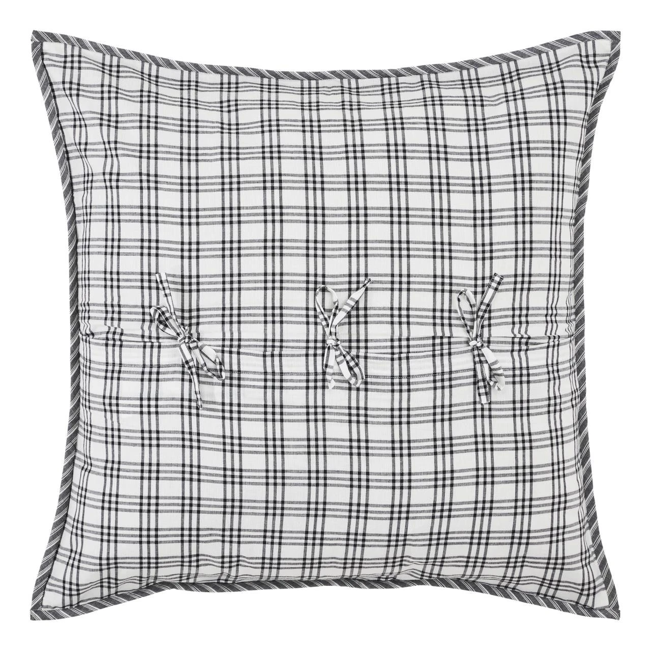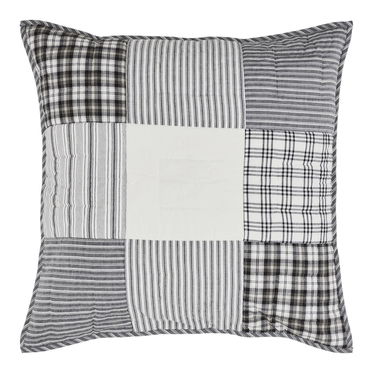 The Sawyer Mill Black Pillow Sham by VHC offers a random patchwork block pattern with woven plaids, stripes, and solids that incorporate shades of black and candlelight white! Perfect for any decor!