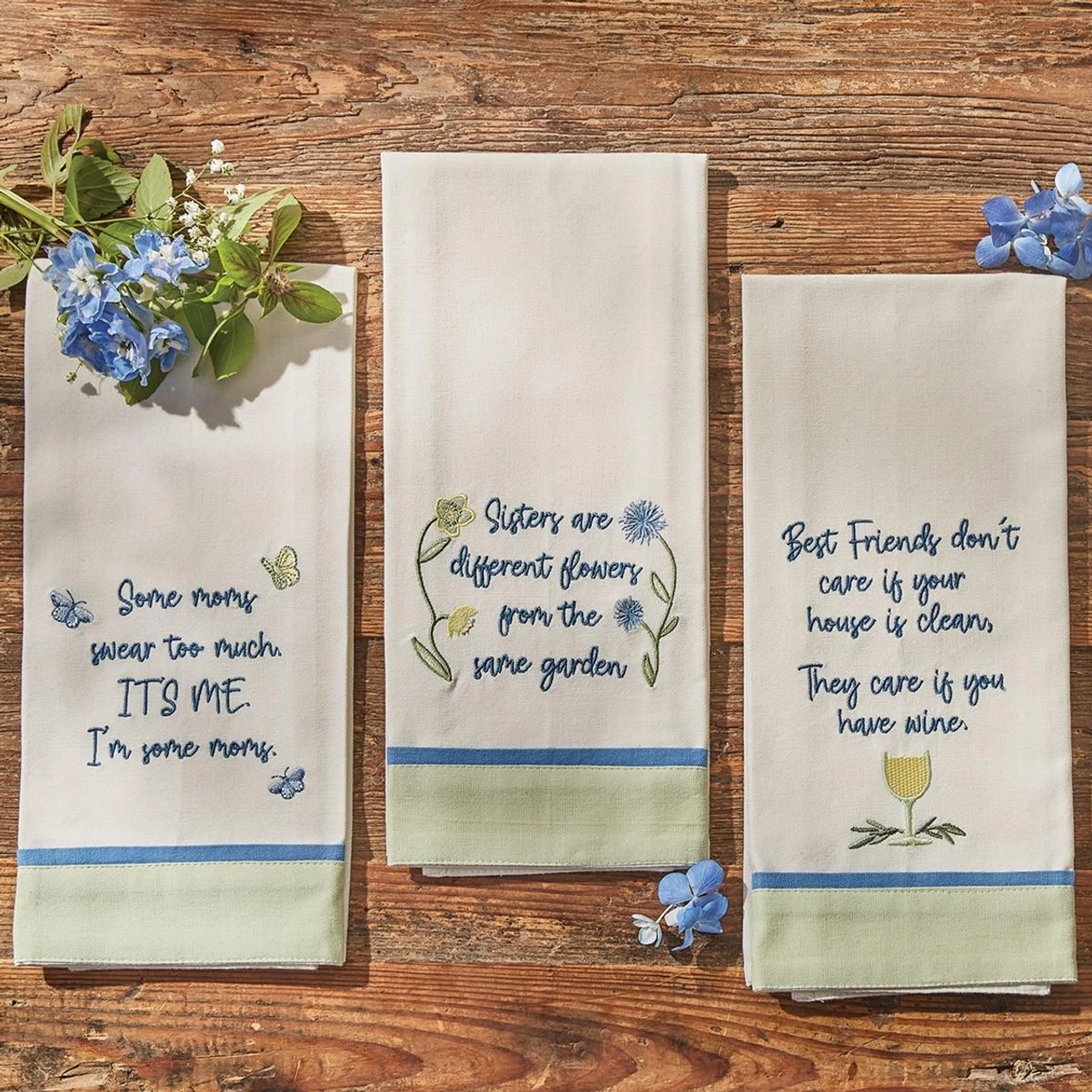 Add a bit of humor and style to your home with these Some Moms Swear Dishtowels by Park Designs! Pair them with the Sisters Are Different, Friends Don’t Care, Grandmas Never Run Out, and Butterflies Have Danced Dishtowels, for a complete look!
