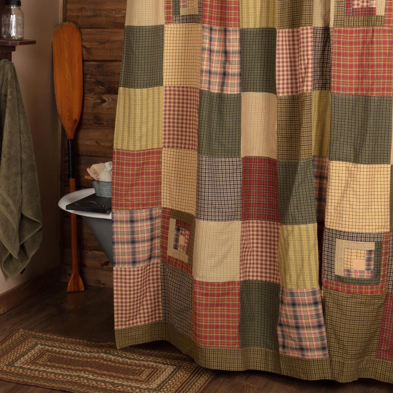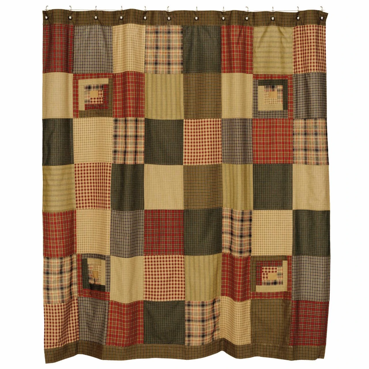 The Tea Cabin Shower Curtain features patchwork blocks that are perfectly finished with a top & bottom plaid border! The restful palette of earthy greens, red, tans & blues provide an outdoorsy feel for your bathroom be it rustic lodge, primitive or traditional country. Time to spice up that bathroom decor!