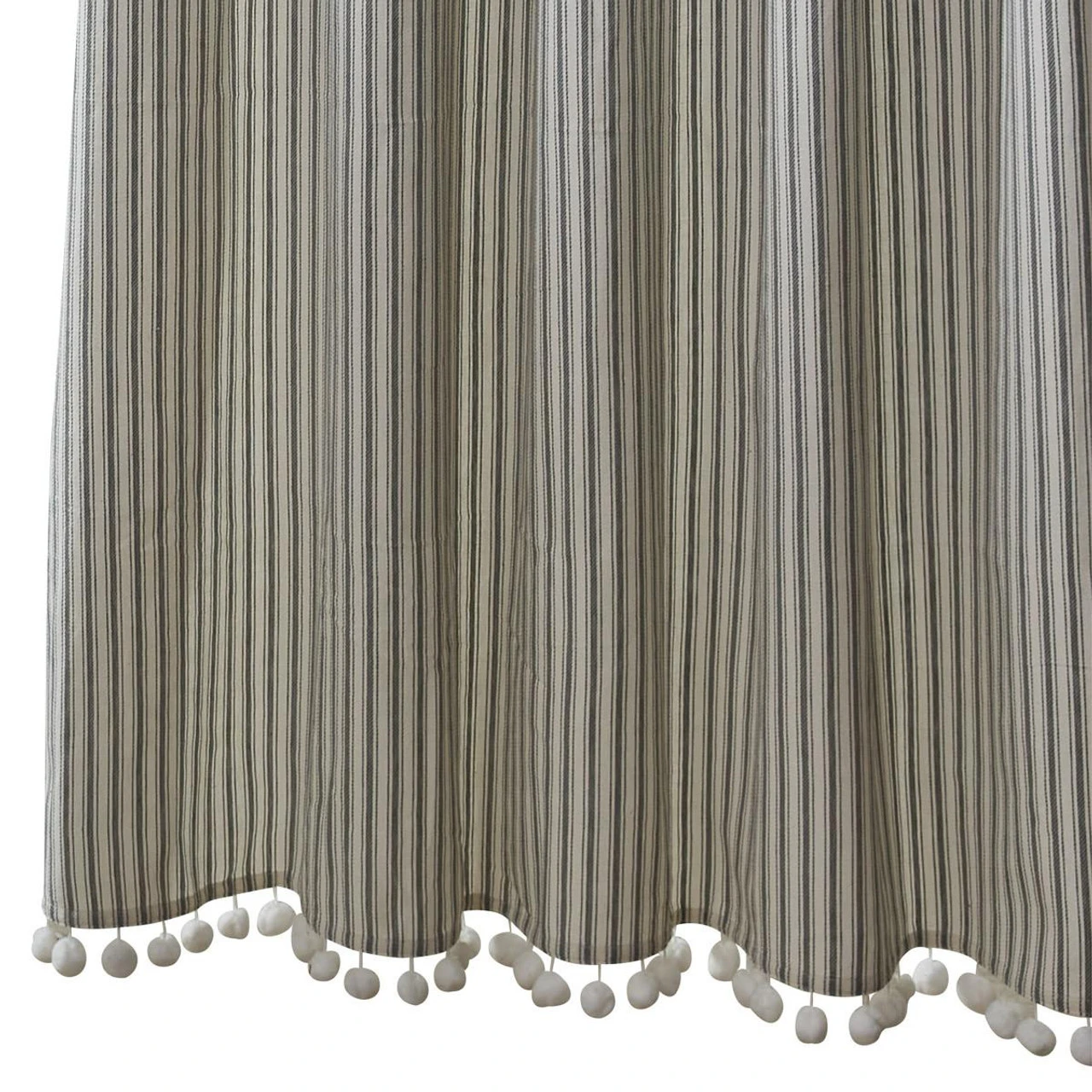 The Ticking With Ball Fringe Shower Curtain by Park Designs will add that classic country look to your bathroom with its charming dove gray and candlelight white striped design! The ball fringe is the perfect finishing touch!